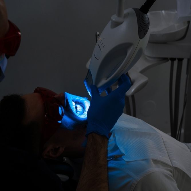Усиление результата. Положительный результат достигается методом последующей дестабилизации связей углеродных, что происходит под воздействием галогенной лампы и ее синего света. Благодаря этому, пероксид гораздо сильнее оказывает влияние на природный оттенок зубной эмали, обесцвечивает его мягче, эффективнее и быстрее.